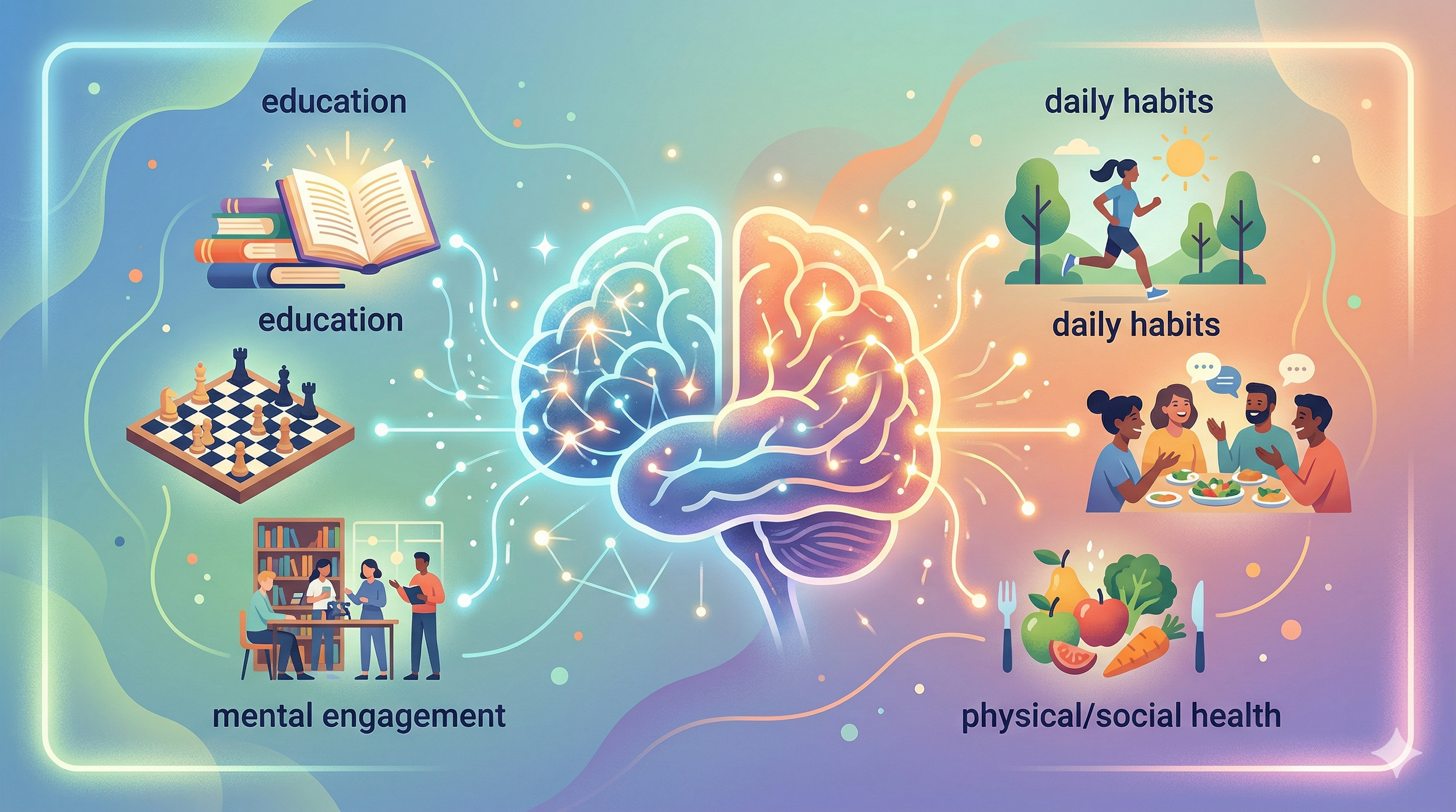 Education and lifelong learning matter: Early and continued learning help build a strong cognitive foundation. Engaging in mentally stimulating activities throughout life strengthens neural connections and supports cognitive reserve.